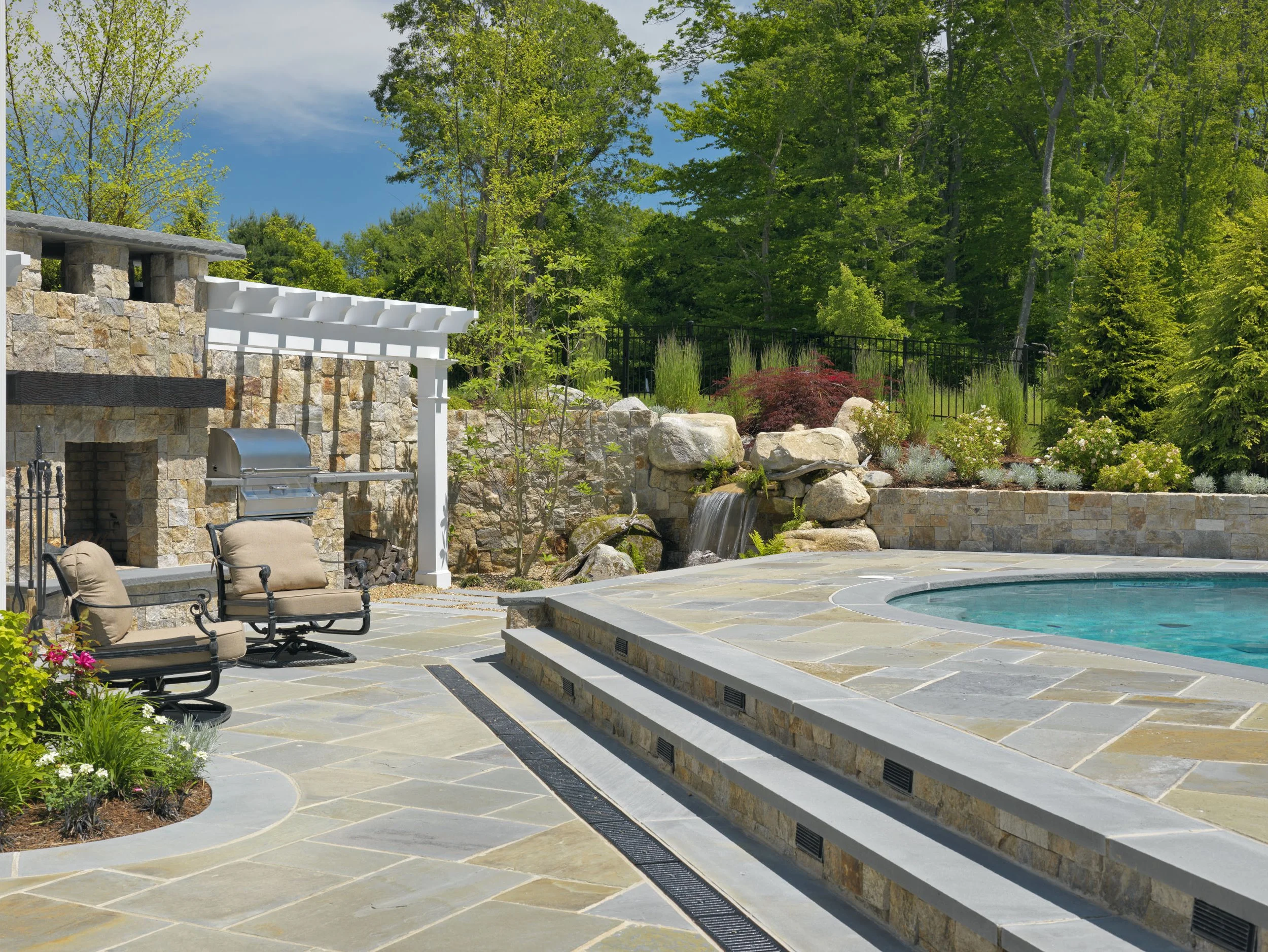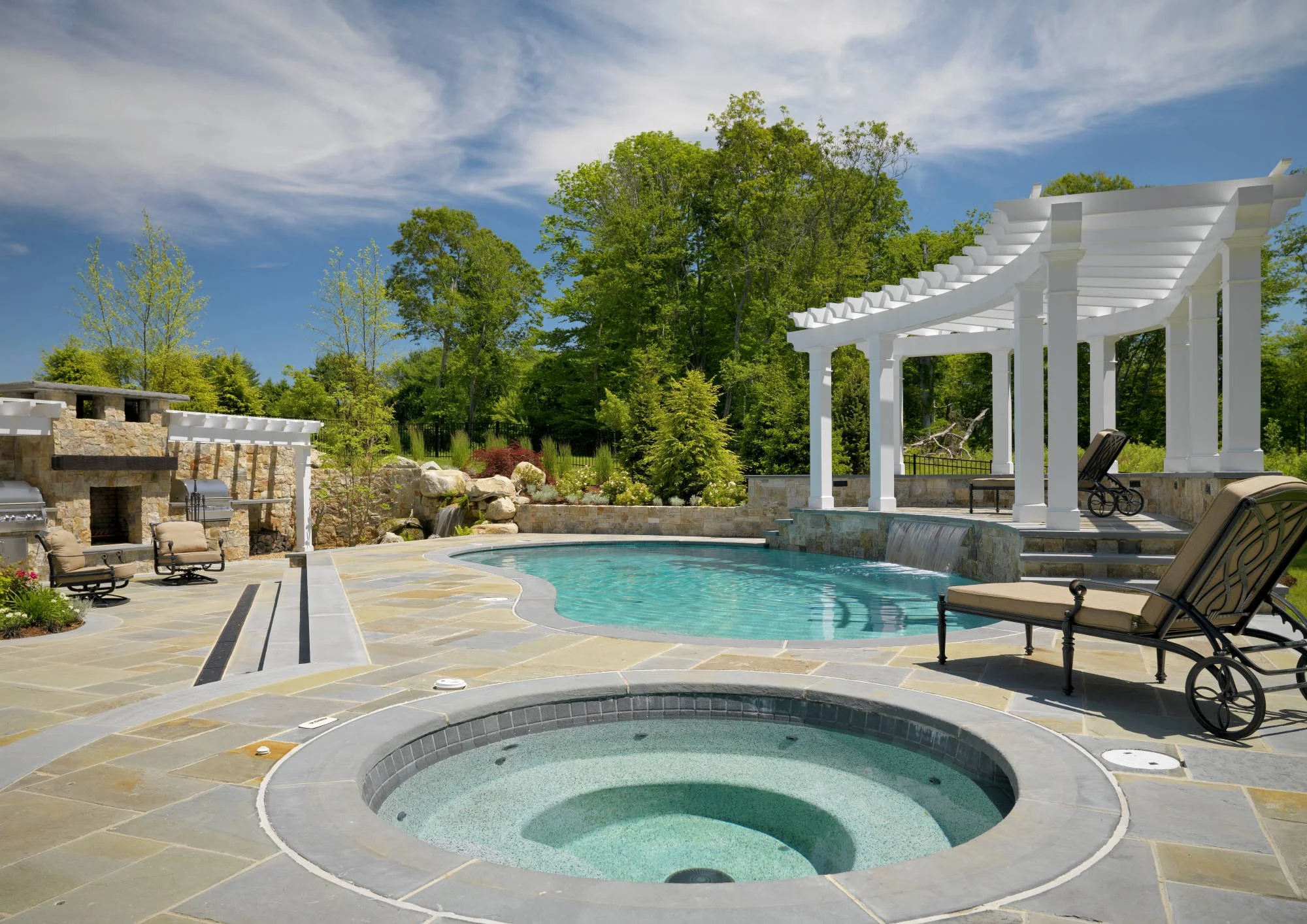 This residence in Dartmouth gives you an amazing feeling as soon as you step onto the property. You are greeted with a manmade stream that drops into a pondless base, an amazing pool with built in jacuzzi, pergola for the shade lovers, bocce court and fire pit in the middle with a gas grill and char-grill.