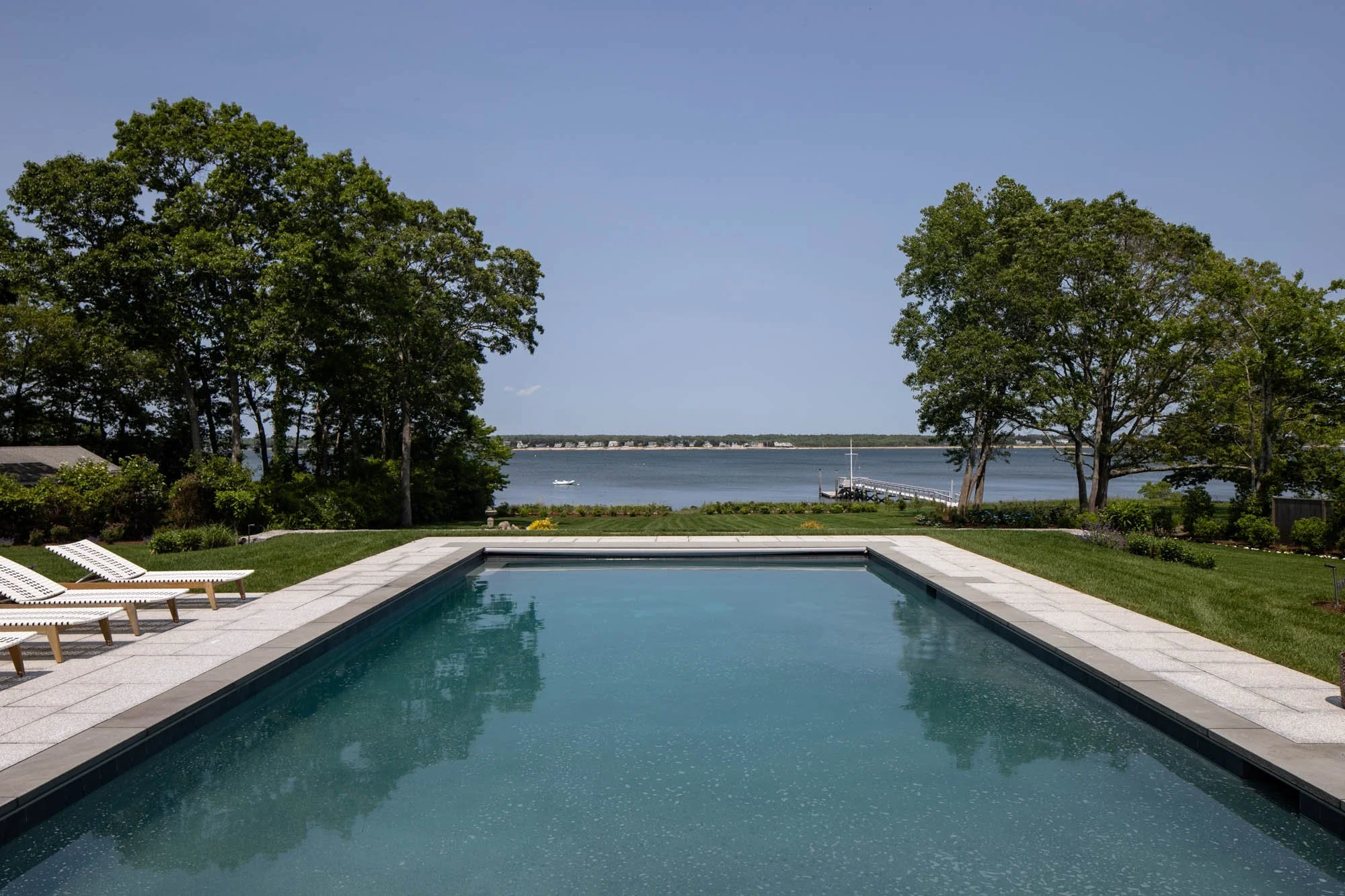 This waterfront property in Marion was designed to complement the clean coastal architecture of the home while creating welcoming outdoor spaces for everyday living. A formal front courtyard with stone walkways and a central fountain sets the tone on arrival, while layered plantings soften the structure and frame views of the harbor beyond. Expansive lawns, garden paths, and thoughtfully arranged beds create a landscape that feels both refined and naturally connected to its seaside surroundings.